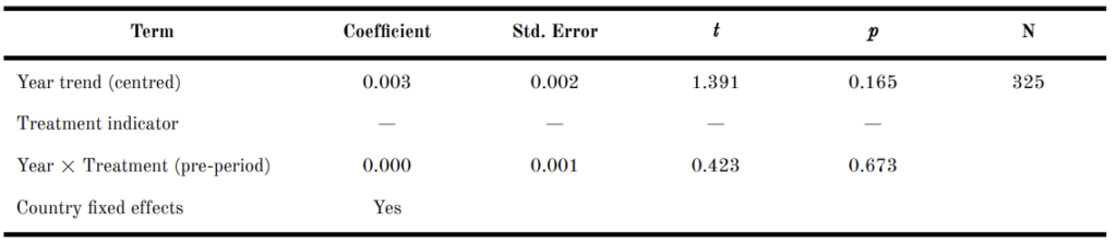where Postt is an indicator for the post-treatment period, Treati is the treatment indicator, γi and δt denote country and year fixed effects, respectively, and β is the DiD estimator of the average treatment effect on the treated (ATT). Standard errors are clustered by country. The parallel pre-trends assumption is tested through an interaction of year trend with treatment indicator in the pre-period.
