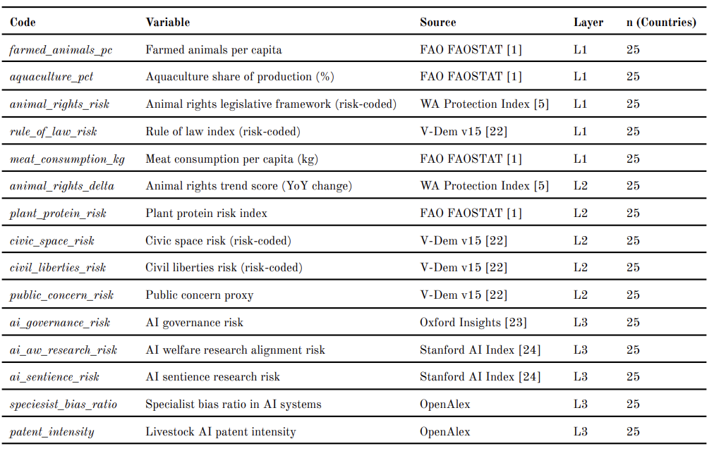 Fifteen variables are assigned across three equal-weighted conceptual layers, with five variables per layer. Layer 1 (L1: Current Welfare State) measures the governance baseline: (1) animal rights legislative framework; (2) rule of law index (risk-coded); (3) farmed animals per capita; (4) aquaculture share of production; and (5) meat consumption per capita. Layer 2 (L2: Policy Trajectory) features the direction and pace of governance change: (6) animal rights trend score (year-on-year legislative change); (7) plant protein risk; (8) civic space risk; (9) civil liberties risk; and (10) public concern proxy. Layer 3 (L3: AI Amplification Risk) quantifies the compounding effect of AI adoption in agriculture: (11) AI governance risk; (12) AI welfare research alignment; (13) AI sentience research risk; (14) specialist bias ratio in AI systems; and (15) livestock AI patent intensity. All 15 variables are coded such that higher values represent greater policy risk. Data are drawn from the World Animal Protection’s Animal Protection Index [5], FAO FAOSTAT [1], the V-Dem Democracy Index [22], the Oxford Insights Government AI Readiness Index [23], the Stanford AI Index [24], and patent databases via OpenAlex. Missing values (approximately 7.3% of observations) are imputed using linear interpolation within country time series.