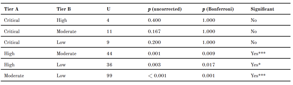 Third, a Kruskal–Wallis test followed by pairwise Mann–Whitney U tests with Bonferroni correction are applied to test whether AWPRI scores differ significantly across risk tiers.