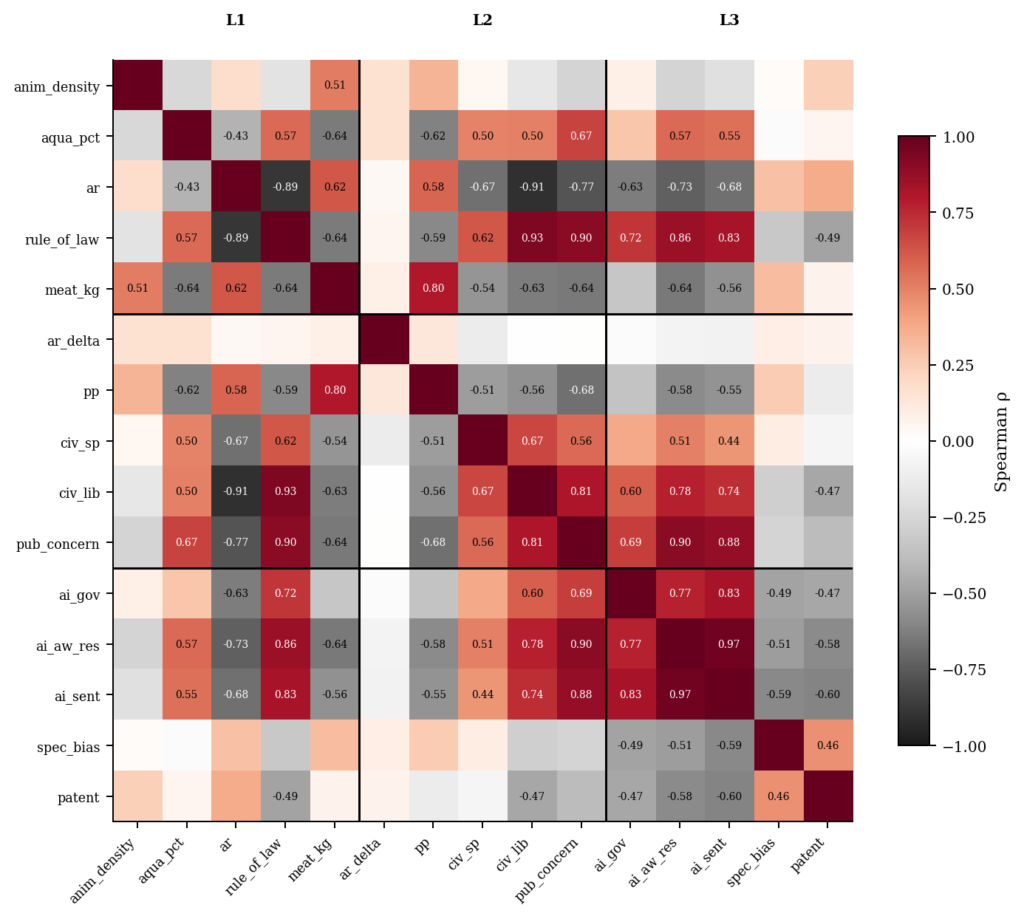 Figure 2 presents selected pairwise Spearman rank correlations among the 15 constituent variables in the 2022 cross-section. We see several high correlations in Figure 2, most notably between ai_aw_research_risk and ai_sentience_risk (ρ = 0.97), and between rule_of_law_risk and civil_liberties_risk (ρ = 0.93). These high within-layer correlations indicate theoretically coherent constructs (i.e., (1) governance quality indicators and (2) AI knowledge indicators, respectively). These two near-redundant pairs (meaning (1) ai_aw_research_risk and ai_sentience_risk (ρ = 0.97) and (2) rule_of_law_risk and civil_liberties_risk (ρ = 0.93)) are retained on theoretical grounds. Here, ai_aw_research_risk measures the degree to which AI welfare research aligns with commercial incentives, whereas ai_sentience_risk features researcher scepticism about AI moral consideration, representing distinct mechanisms. Also, rule_of_law_risk shows formal institutional constraints on arbitrary state action, whereas civil_liberties_risk features the practical exercise of individual freedoms, representing separable dimensions of the governance environment. We can see that the cross-layer correlation structure is modestly lower, with a maximum cross-layer pair of meat_consumption_kg and plant_protein_risk (ρ = 0.80). Figure 2 presents the full 15 × 15 Spearman correlation heatmap.