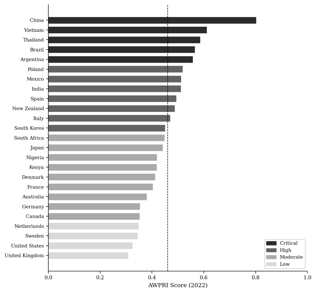 Figure 1: AWPRI Rankings by Country, 2022. Countries ordered by AWPRI score (ascending). Dashed line = sample mean (0.461). Shading indicates risk tier.