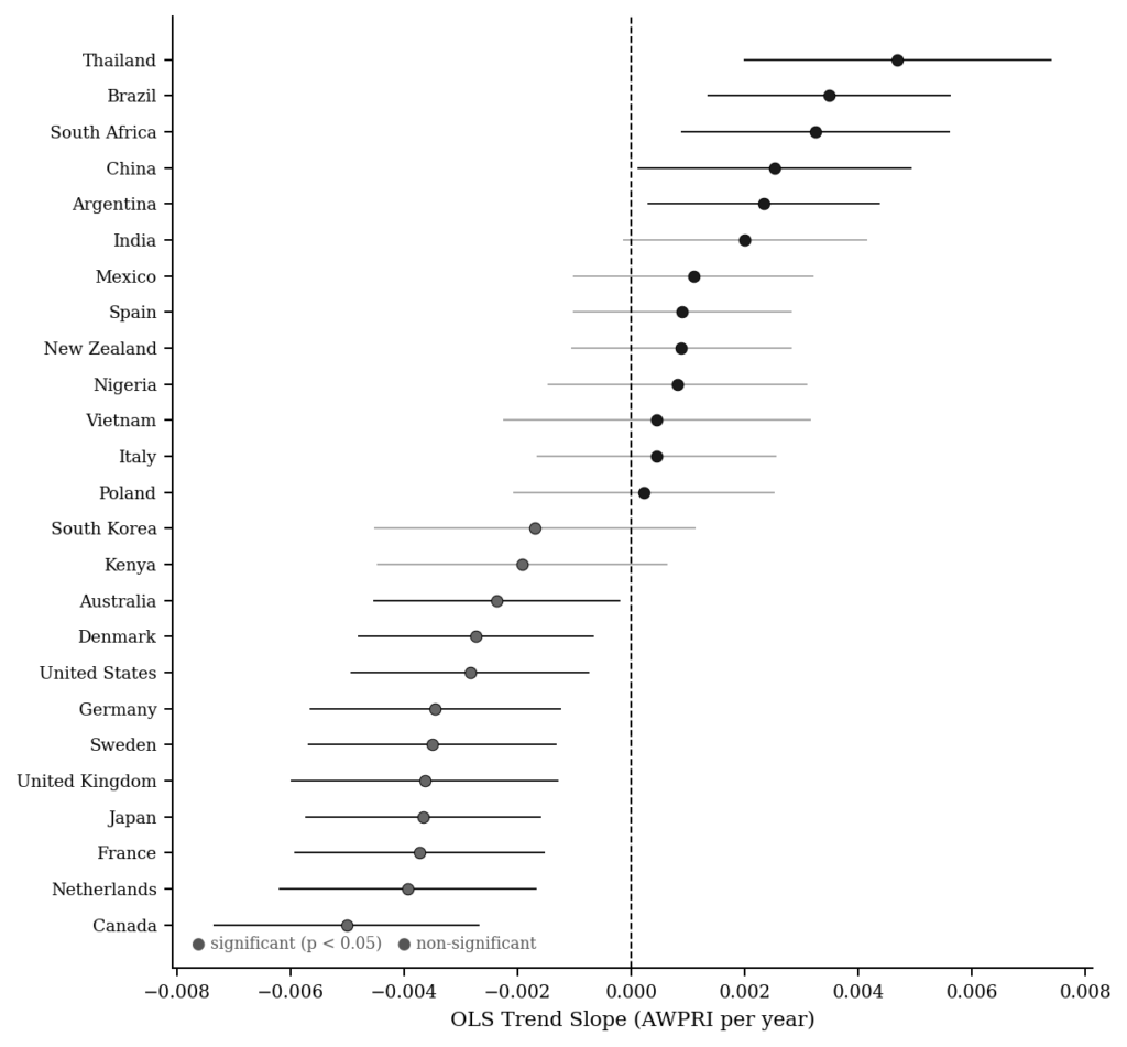 Note. Trend column reports direction and significance of Ordinary Least Squares (OLS) trend slope (AWPRI ~ year, 2004–2022). * p < 0.05; ** p < 0.01; *** p < 0.001; ns = non-significant.