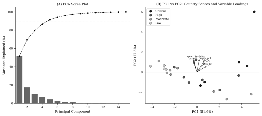 Figure 8: PCA, 15-Variable Cross-Section, 2022. (A) Scree plot. Dashed line at 90% cumulative variance. (B) PC1–PC2 biplot. Arrows indicate the top-loading variables; country scores shaded by risk tier.