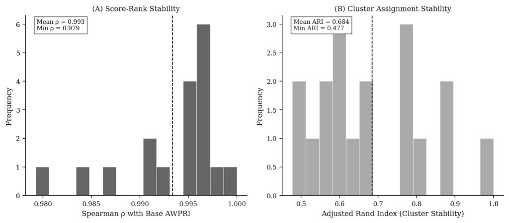 Figure 9: Sensitivity Analysis under ±10 Percentage-Point Layer Weight Perturbation. (A) Distribution of Spearman ρ between perturbed and base AWPRI ranking. (B) Distribution of ARI for cluster assignment stability.