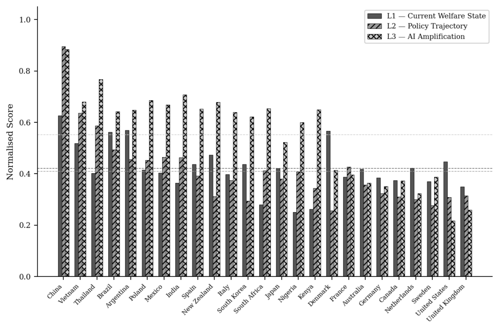 Figure 3 presents the layer score decomposition across all 25 countries. A notable pattern is that L3 scores usually exceed the L1 and L2 counterparts for the majority of the sample, including countries with comparatively strong governance baselines such as Germany (L3 = 0.352), Sweden (L3 = 0.388), and the United Kingdom (L3 = 0.260). These findings preliminarily suggest that stronger animal welfare legislation and favourable policy trajectories do not systematically lower AI amplification risk, a finding that is tested in Section 4.5.