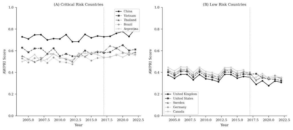 Figure 5: AWPRI Temporal Trajectories, 2004–2022. (A) Critical Risk countries. (B) Low and selected Moderate Risk countries. Dashed vertical line at 2017 indicates the onset of AI governance risk differentiation.