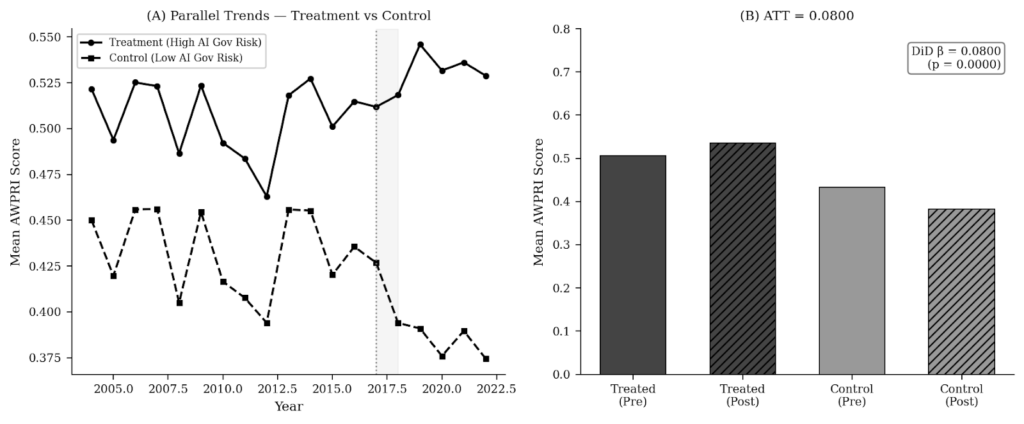 Note. Dependent variable: AWPRI composite score. Pre-period defined as 2004–2016 (years prior to treatment onset). Treatment group (n = 14): countries classified as high AI governance risk by the 2019 Oxford Insights assessment. Control group (n = 11): countries classified as low AI governance risk. Year trend is mean-centred. Treatment indicator is absorbed by country fixed effects and, therefore, not separately estimated. The non-significant Year × Treatment coefficient (p = 0.673) indicates that treated and control countries followed statistically indistinguishable AWPRI trajectories in the pre-period, supporting the validity of the DiD design. Standard errors are heteroskedasticity-robust.