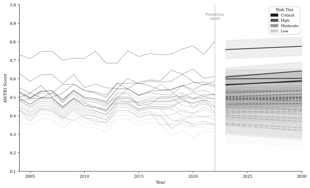 Figure 10: ARIMA-Based AWPRI Projections to 2030, All 25 Countries. Lines indicate mean forecasts from 2023; shading indicates 95% confidence intervals. Trajectory colours indicate 2022 risk tier. Dashed vertical line at 2022 marks the projection onset.